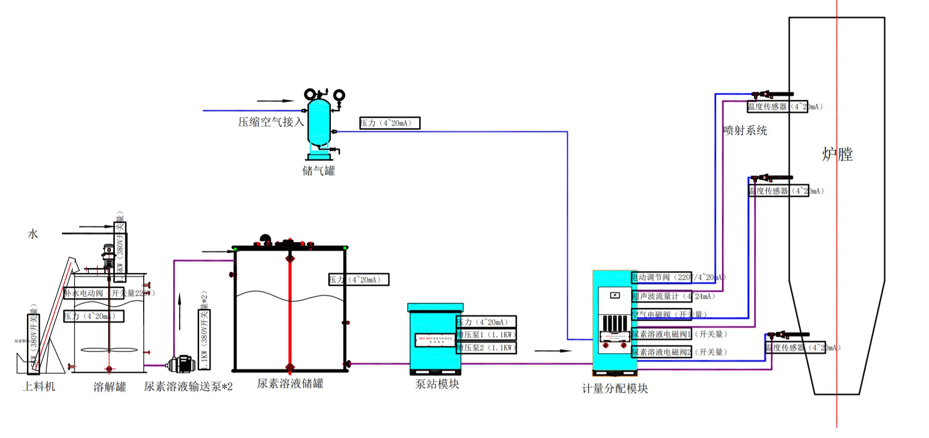 SNCR脫硝系統(tǒng)主要由還原劑溶液/制備系統(tǒng)(還原劑配置系統(tǒng)/氨水卸載系統(tǒng))、還原劑溶液儲(chǔ)存系統(tǒng)、加壓及控制系統(tǒng)(還原劑增壓&空氣增壓)、控制計(jì)量分配系統(tǒng)、霧化噴射系統(tǒng)組成。